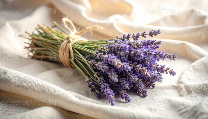 Пучок свежих фиолетовых цветов лаванды, связанных веревочной нитью на мягкой белой нейтральной цветной ткани