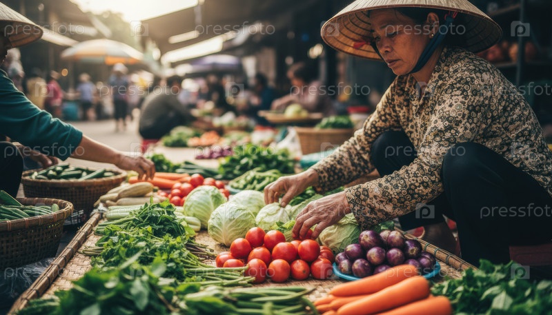 Продавец местного азиатского рынка устраивает свежие овощи на уличном киоске, представляющем традиционную торговлю, культуру повседневной жизни и торговлю органическими продуктами питания