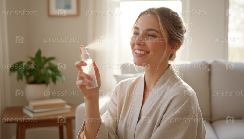 Улыбающаяся женщина использует лицо тумана в цвете Cloud Dancer, который представляет собой самообслуживание благополучие красоты уход за кожей рутины и здоровый образ жизни тренд