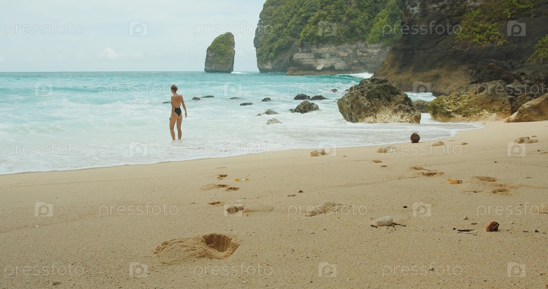 Взрослая девушка развлекается у океана в Нуса-Пениде, Бали, Индонезия