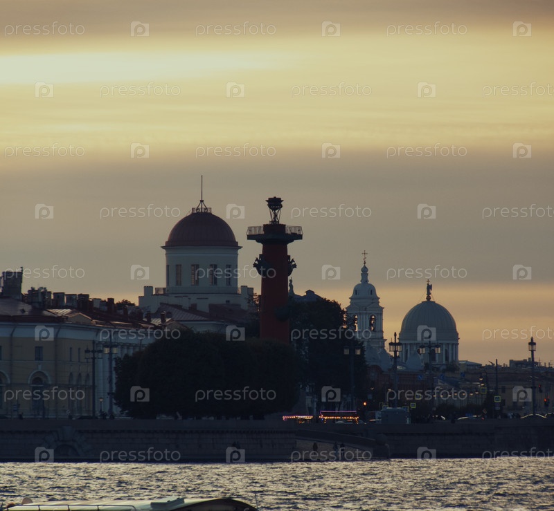Вечерний вид на Ростральные Колонны, соборы и Неву-реку