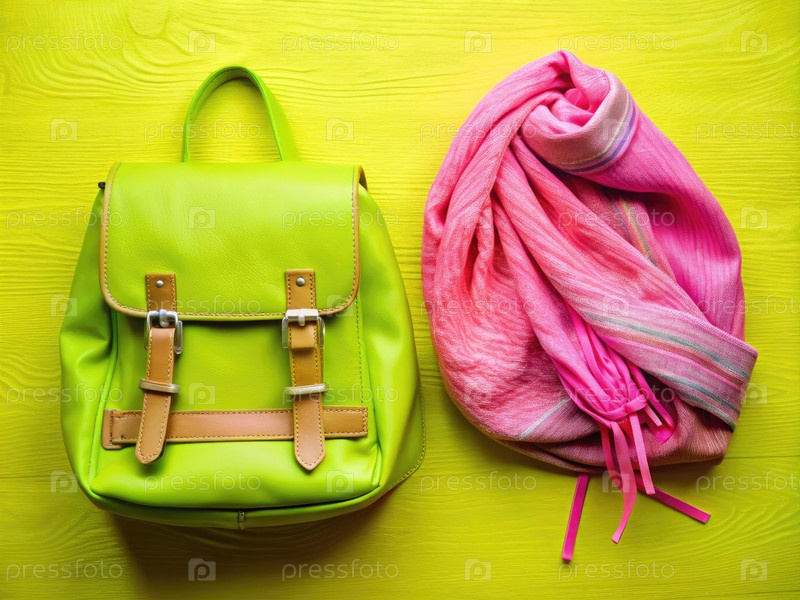 Яркий лаймовый зеленый шарф и розовый рюкзак отображаются на яркой желтой шкале
