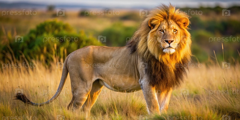 Величественный лев на золотых лугах во время заката, демонстрируя свое мощное присутствие