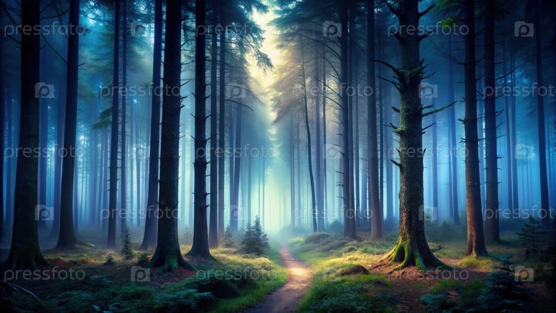 Загадочный темный лес с тропой, освещенной мягким утренним светом