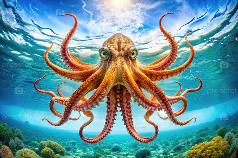 Гигантская кальмара грациозно скользит по яркой подводной среде в полдень