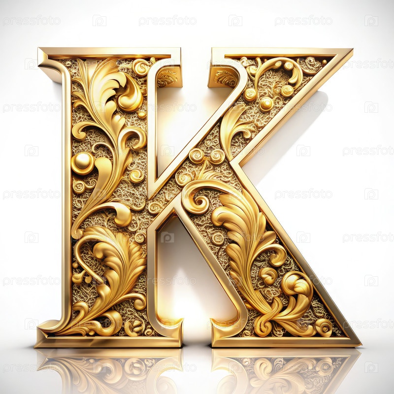Украшенная золотая буква K со сложными цветочными узорами на белом фоне