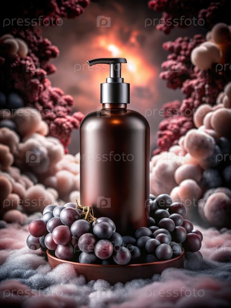 Гигантская бутылка коричневого шампуня с черным диспенсером, окруженный виноградом в туманной обстановке
