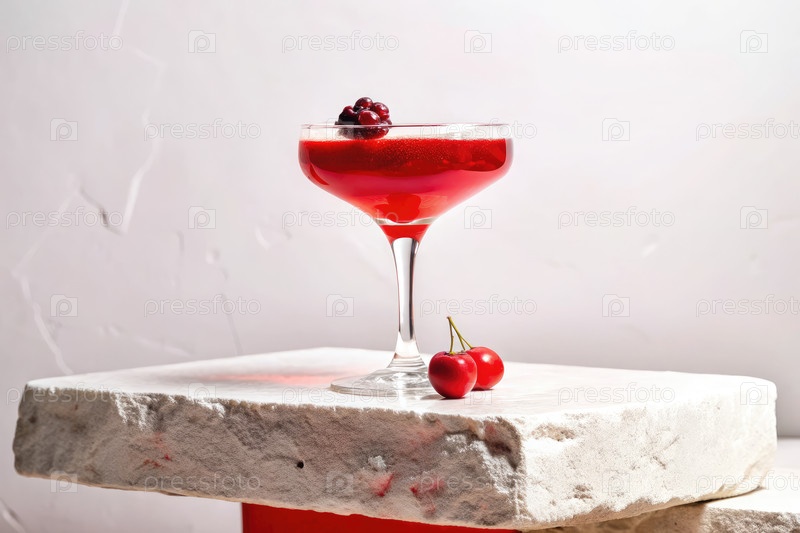 Красный коктейль, украшенный вишней на каменном столе с простым фоном