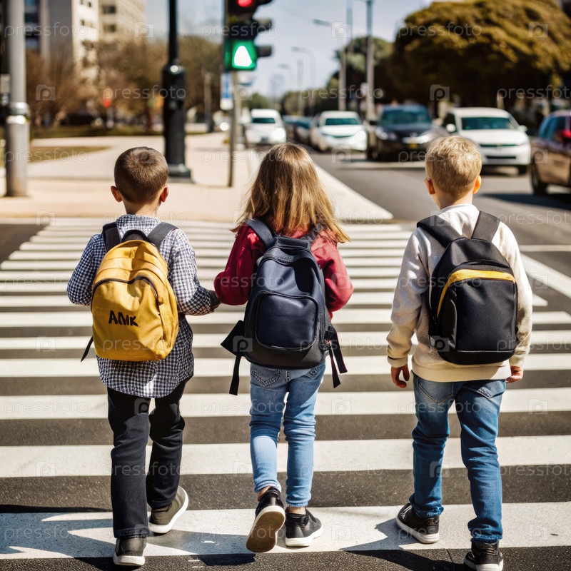 Дети пересекают улицу на светофоре с рюкзаками в течение дня. генеративный ИИ