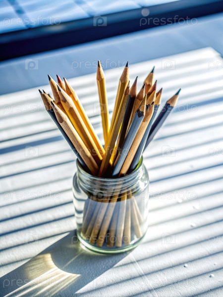 Карандаши расположены в стеклянной банке на синем столе под естественным светом