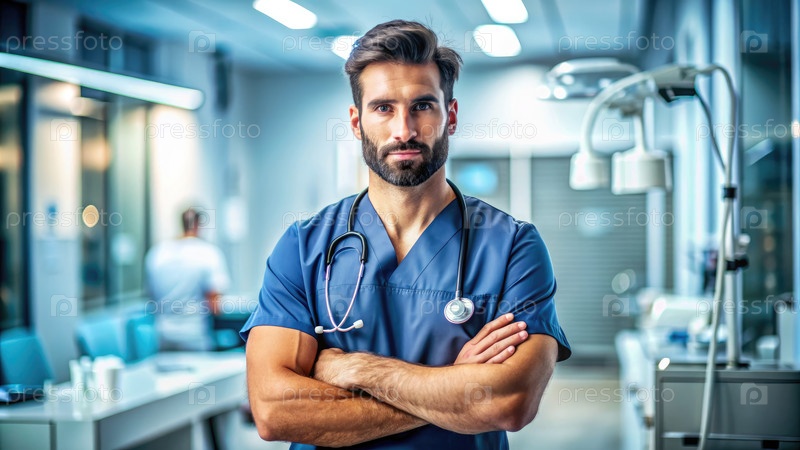 Уверенный медицинский работник, стоящий ночью в современной больнице