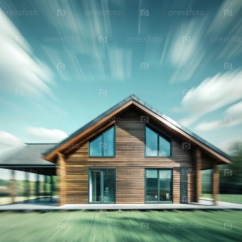 Стильный деревянный дом с большими окнами в спокойной окружающей среде. генеративная ИИ