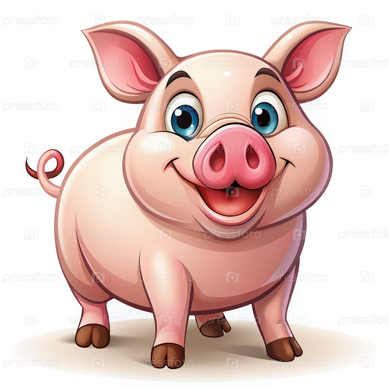 Счастливая мультсериальная свинья стоит на стандартной шкале с веселым выражением лица