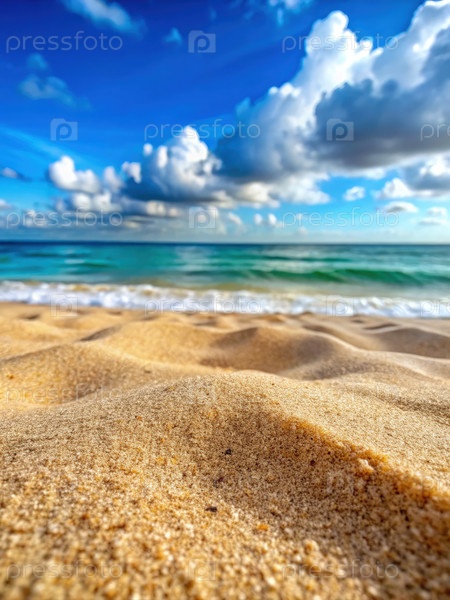 Близкий план песчаного пляжа с голубым морем и облаками в солнечный день