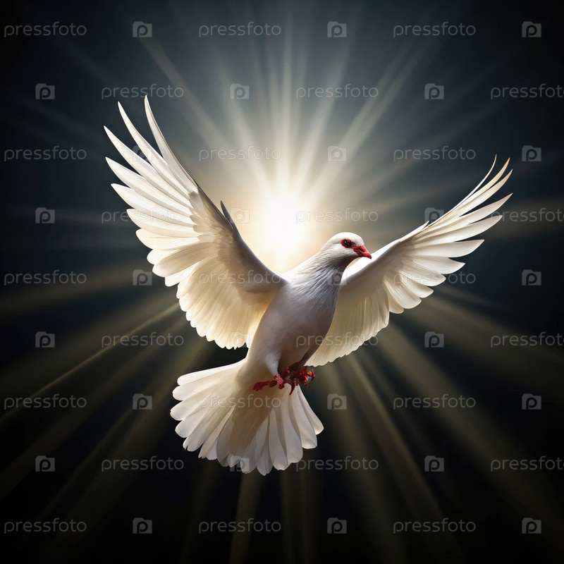 Белый голубь грациозно летает на черном фоне с ярким светом