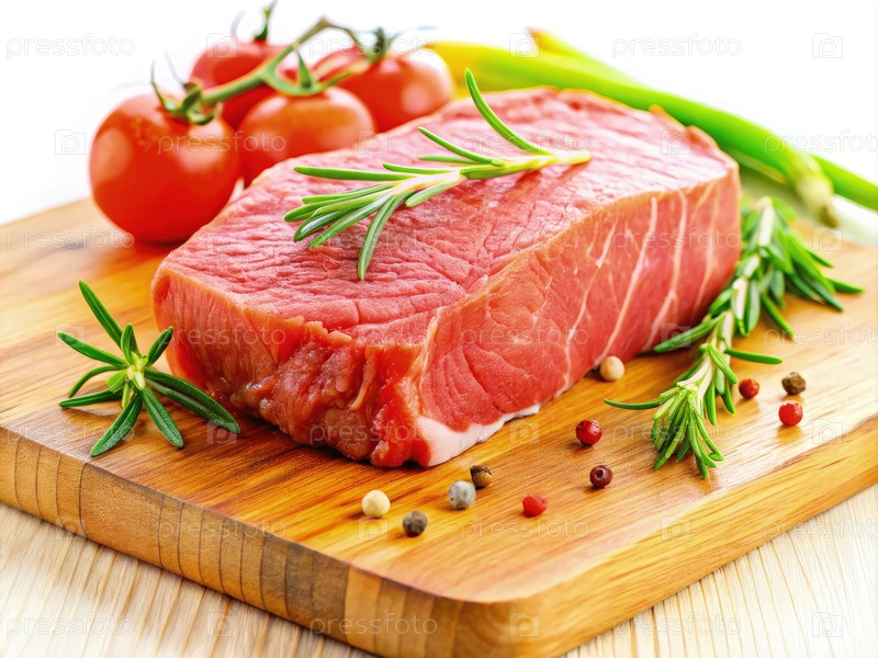 Стрейк с свежими травами и помидорами на деревянной доске для резки