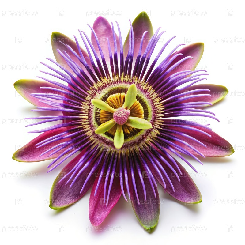 Увлекательный фиолетовый цветок страсти имеет сложные узоры на белом фоне
