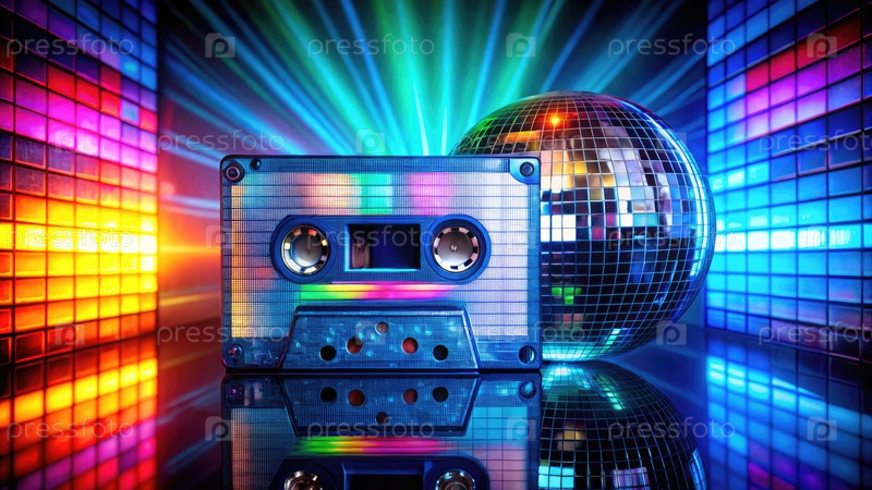 Цветная аудиокассета и дискотечный мяч на ярком танцполе ночью