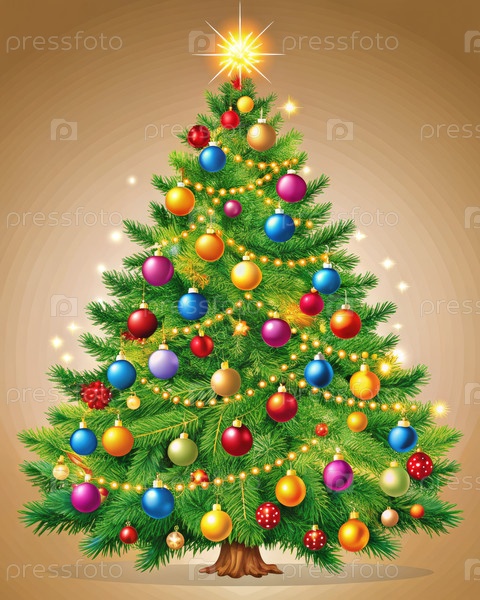 Красочная рождественская елка, украшенная орнаментами и огнями во время праздничного сезона