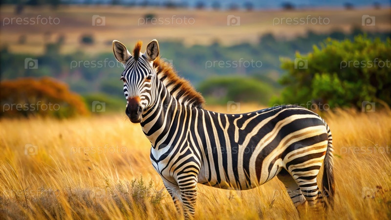 Зебра, пасущаяся на золотистых лугах во время заката в саване