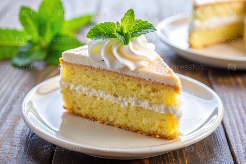 Вкусный кусок ванильного торта с битой смесью и листьями мяты на деревянном столе