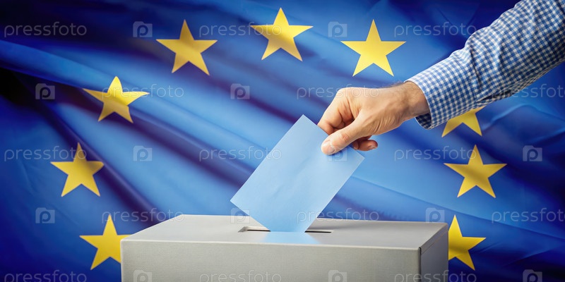 Человек, бросающий бюллетень в урну для голосования на фоне сине-желтого флага