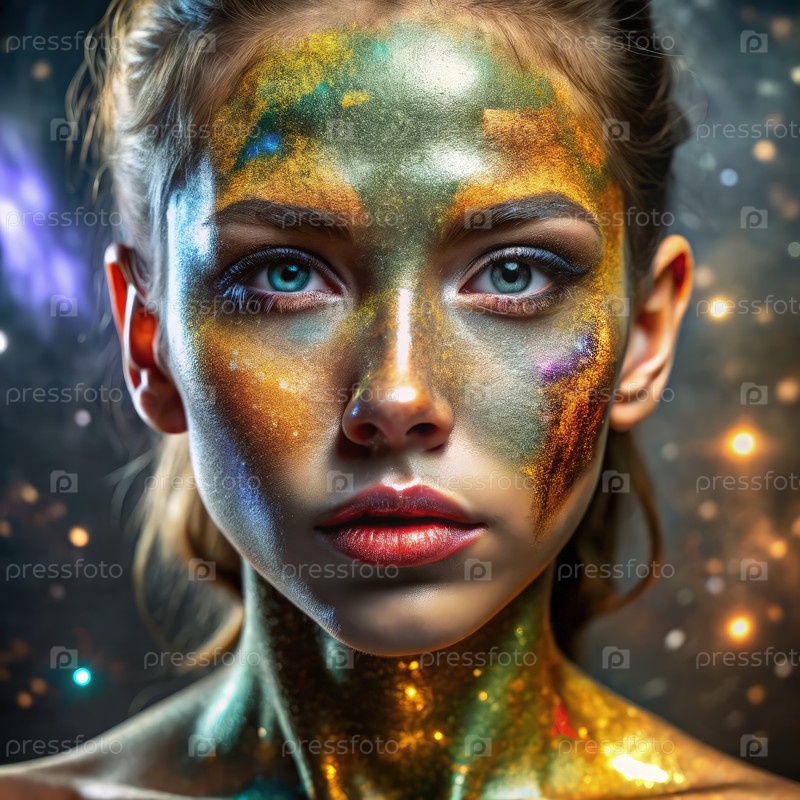 Космический портрет с градиентными волосами и яркой краской лица на звездном фоне