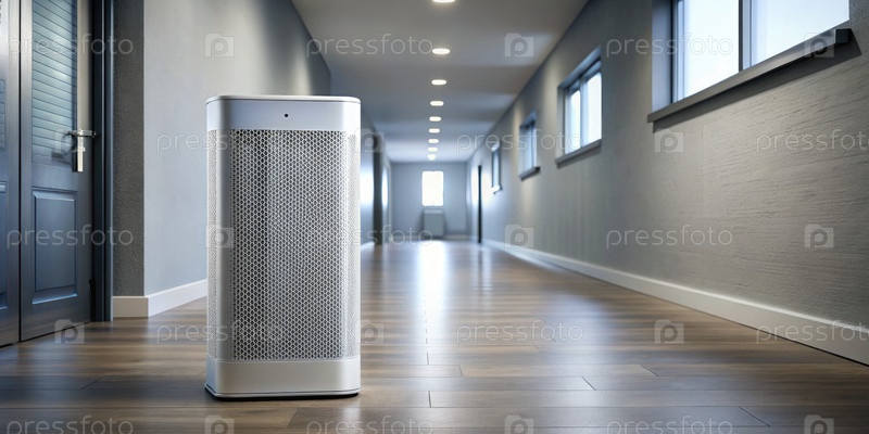 Очиститель воздуха размещен в сером коридоре с естественным светом днем. генеративный ИИ