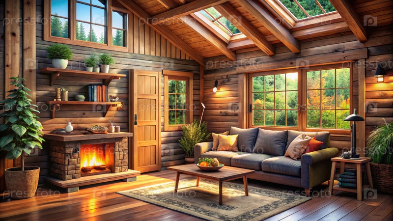 Уютный крошечный интерьер кабинки дома с естественным светом и элементами деревенского дизайна