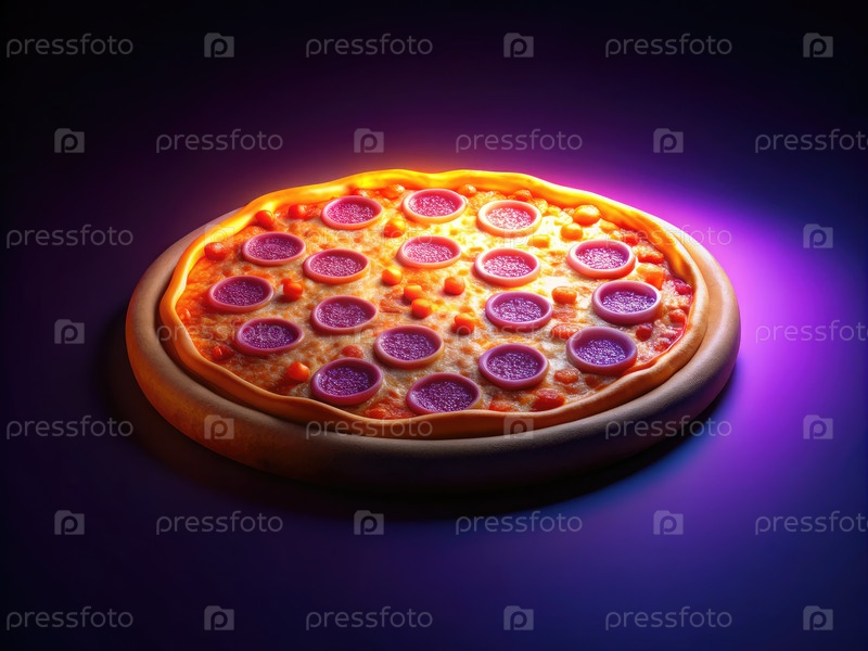 Неон-фиолетовая и оранжевая пицца с пеперони на темном фоне