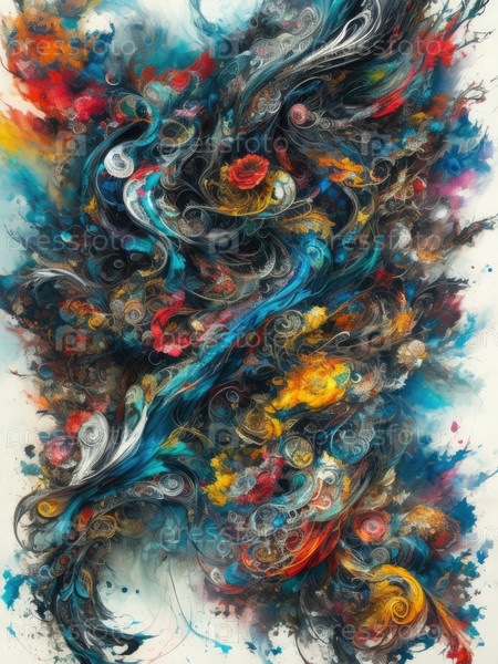Вибрирующий вихрь текущего черного чернил и цветов в динамической абстрактной композиции