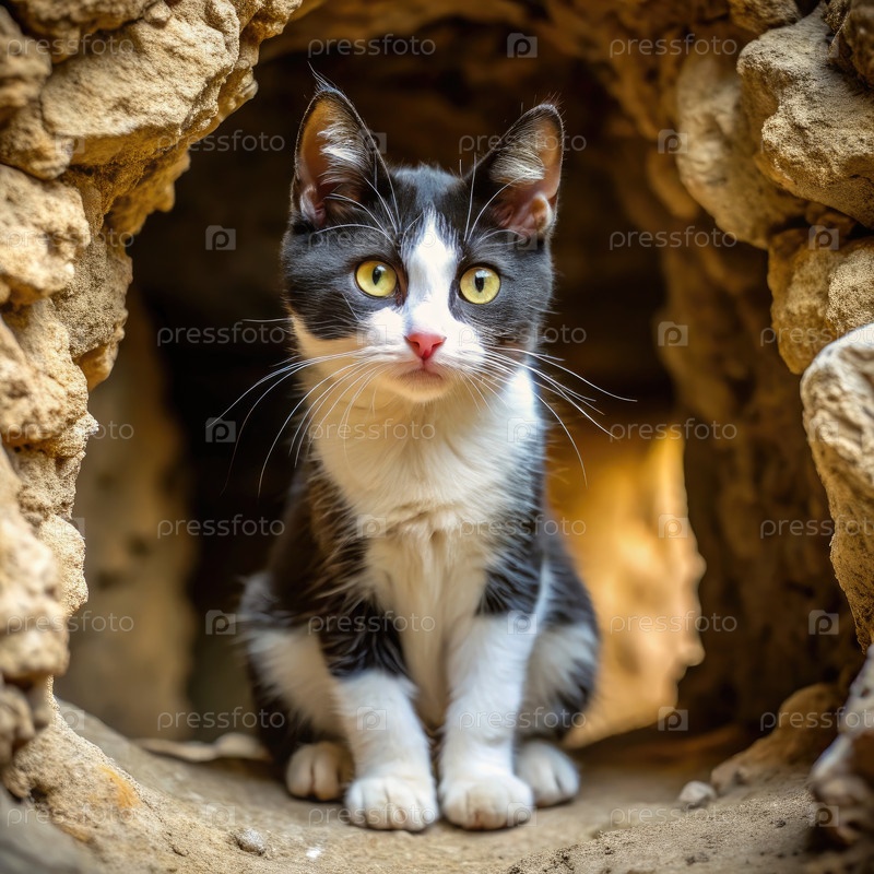 Молодая черно-белая кошка сидит внутри пещерной структуры под мягким солнечным светом