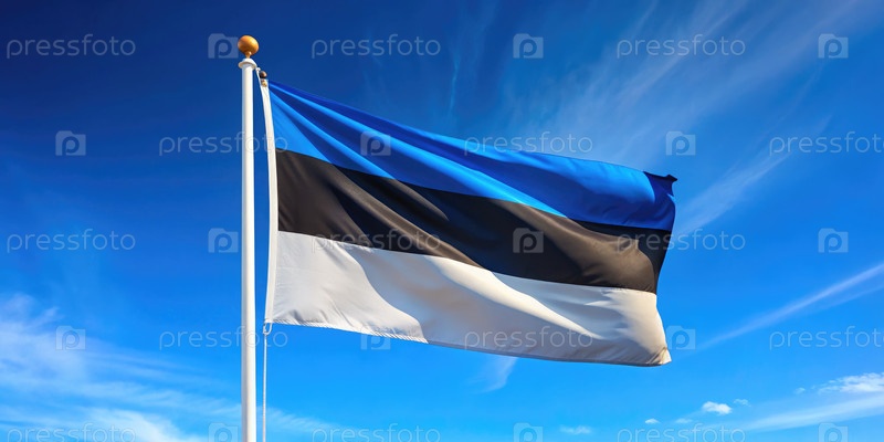 Эстонский флаг, размахивающий против чистого синего неба в солнечный день
