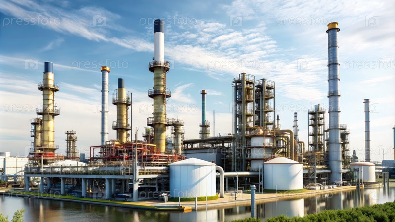 Нефтяная нефтеперерабатывающая фабрика с обширными трубопроводами и промышленной инфраструктурой под ясным небом