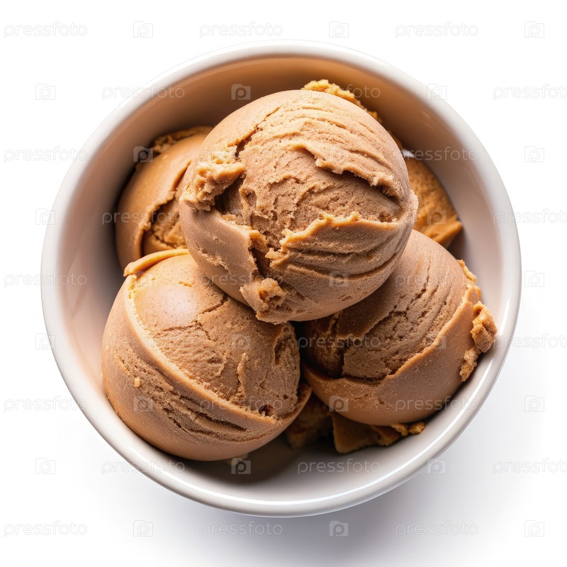 Белая чаша, наполненная шоколадным мороженым из арахисового масла с высоты