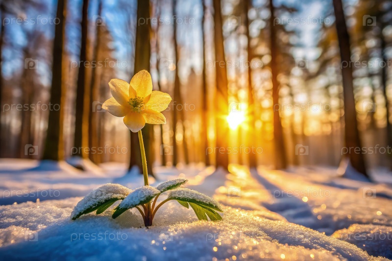 Желтый цветок расцветает в зимнем лесу, когда солнечный свет проникает сквозь деревья