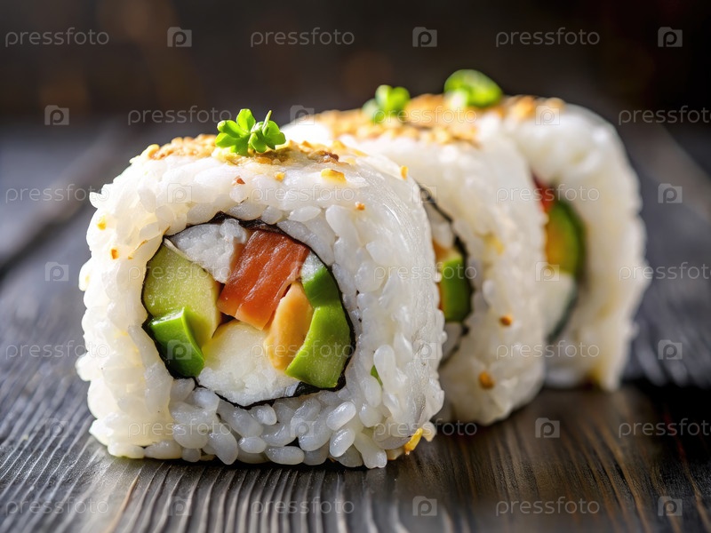 Вкусные рулоны суши со свежими ингредиентами на деревянном столе