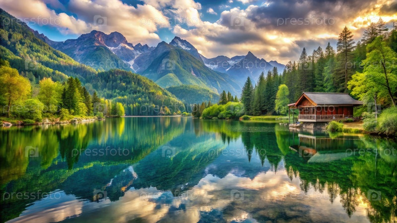Спокойное озеро, отражающее горы и яркие леса во время золотого часа