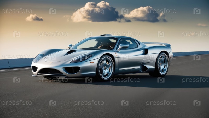 Гладкий металлический серебряный спортивный автомобиль с крыльцовыми дверями на открытой дороге при закате