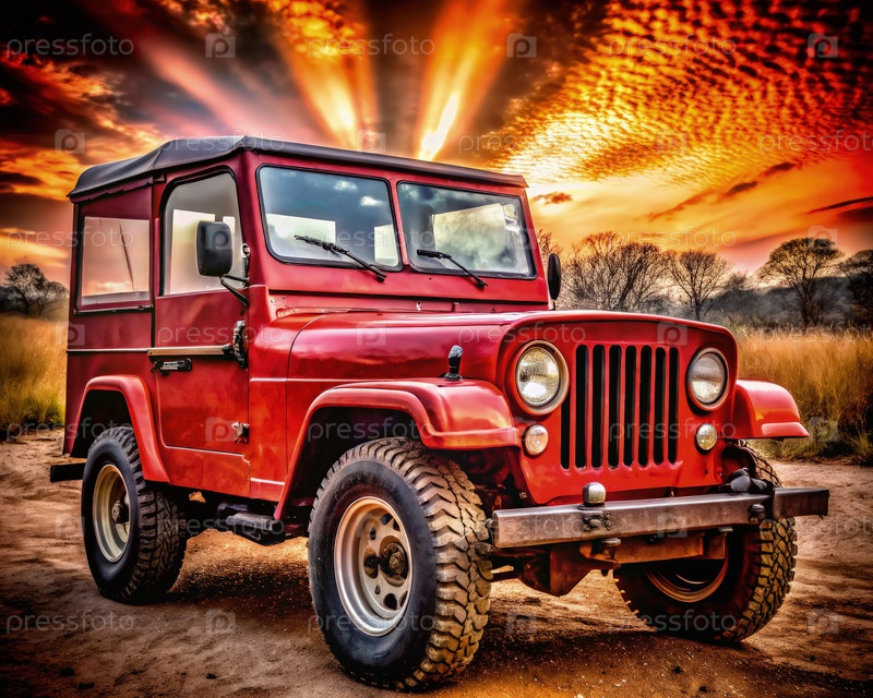 Красный джип Willys припаркован против потрясающего заката на открытом поле