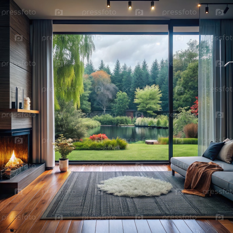 Современная гостиная с видом на спокойный ландшафт с пышной зеленью и прудом