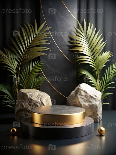 Стильный черно-золотой дисплей с тропическими листьями и уникальными особенностями камня. генеративный ИИ