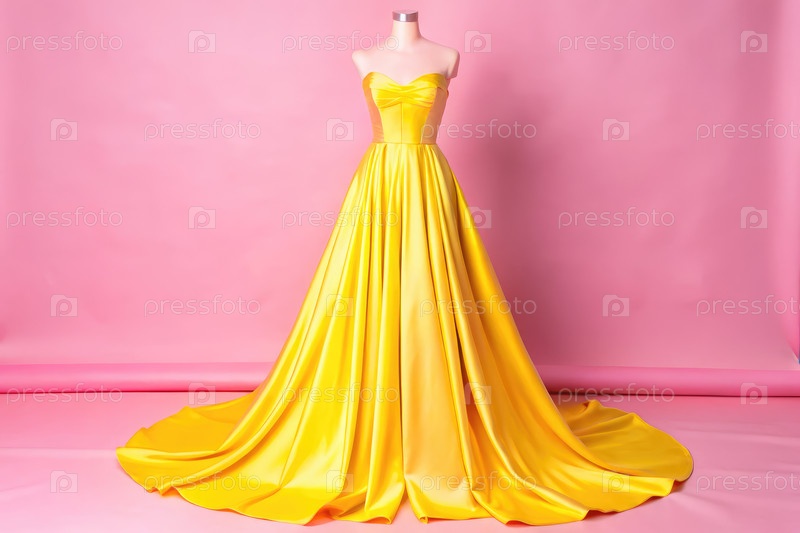 Потрясающий полный фронтальный вид ярко-желтого платья высокой моды на выставке