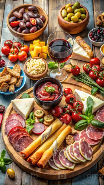 Вкусные аппетиты для антипасти разложены на деревянном столе