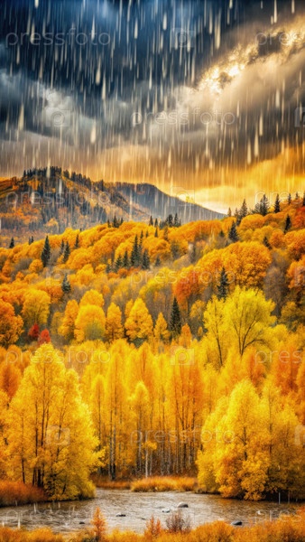 Величественный осенний пейзаж с яркими цветами среди мягкого дождя