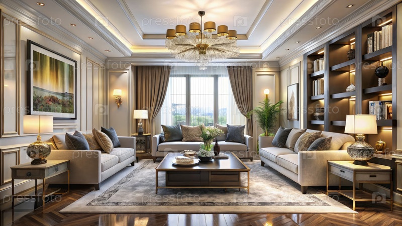 Элегантный дизайн интерьера гостиной с современным декором и освещением окружающей среды