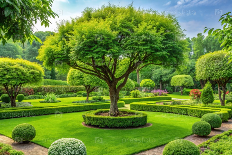 Роскошный зеленый сад с аккуратно подрезанными жилами и величественным деревьями на фоне