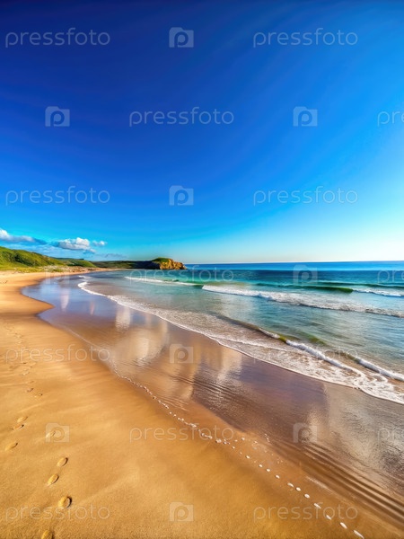 Спокойный пляж под чистым голубым небом в золотое время суток