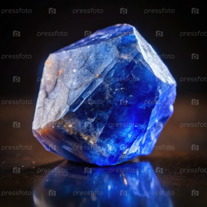 На выставке представлен сырой кристалл сапфира, демонстрирующий естественную красоту при слабом свете