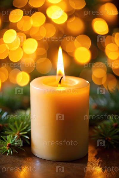 Теплая свеча мерцает среди мигающих огней и праздничной зелени